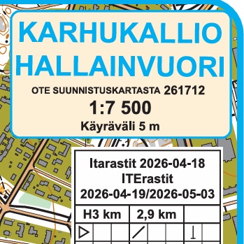 Iterastit – Karhukallio-Hallainvuori, 5 ratavaihtoehtoa (6km, 5km, V4km, H3km ja H2km) sekä kaikki rastit kartta (tee oma ratasi).
